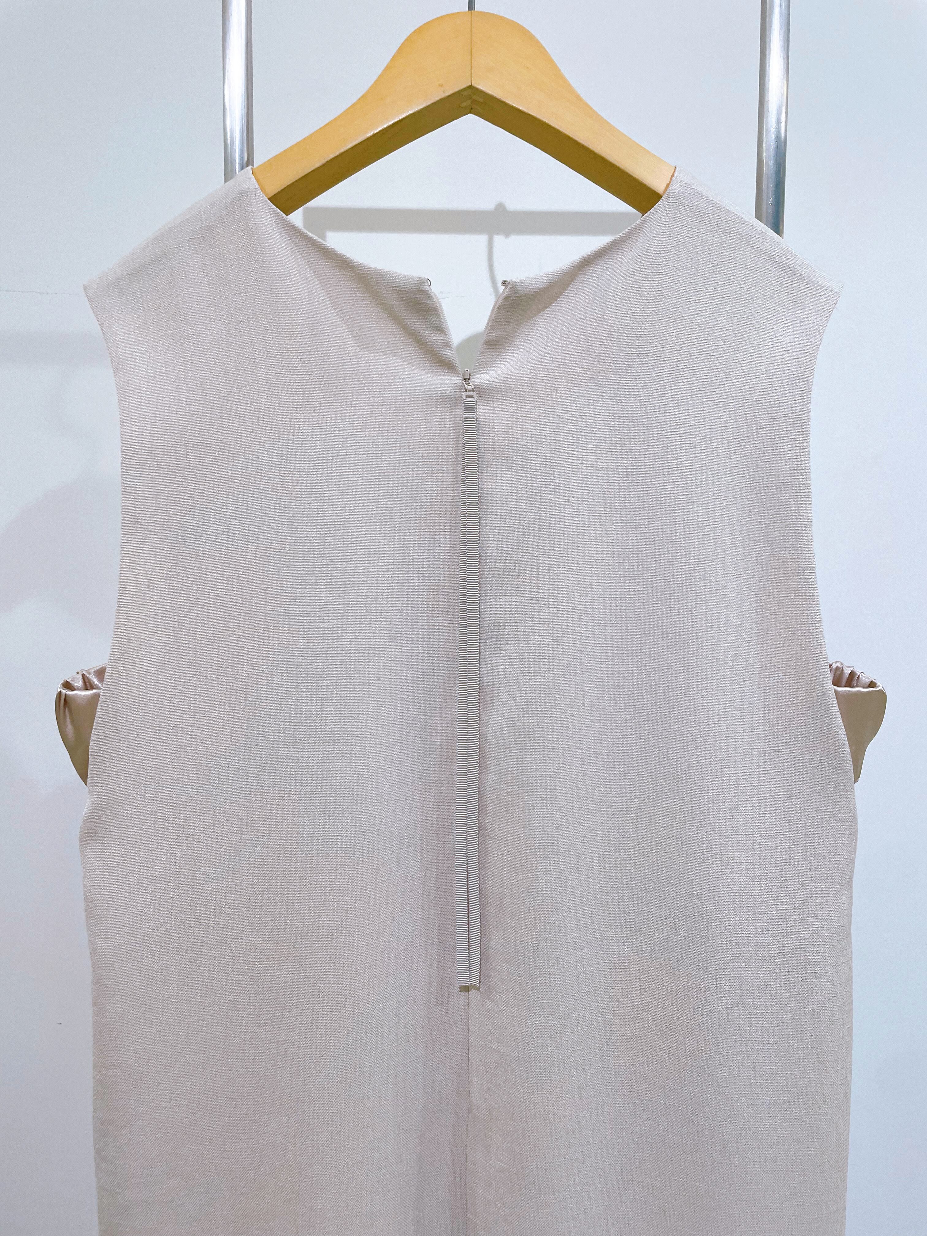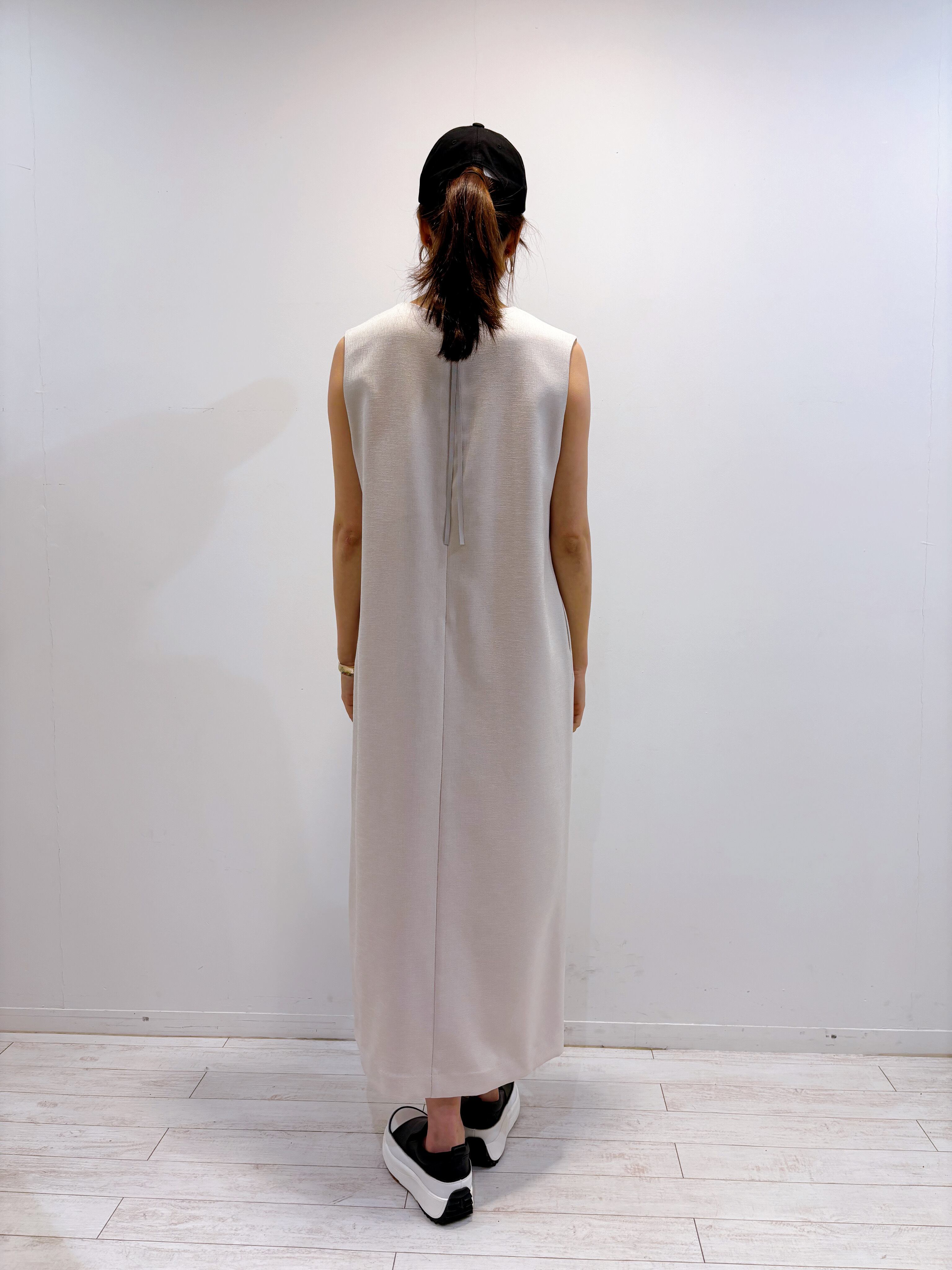 ・シンプルなVネックのジャンパースカート、両サイドに抜け感のあるデザインを施しているのがポイント。