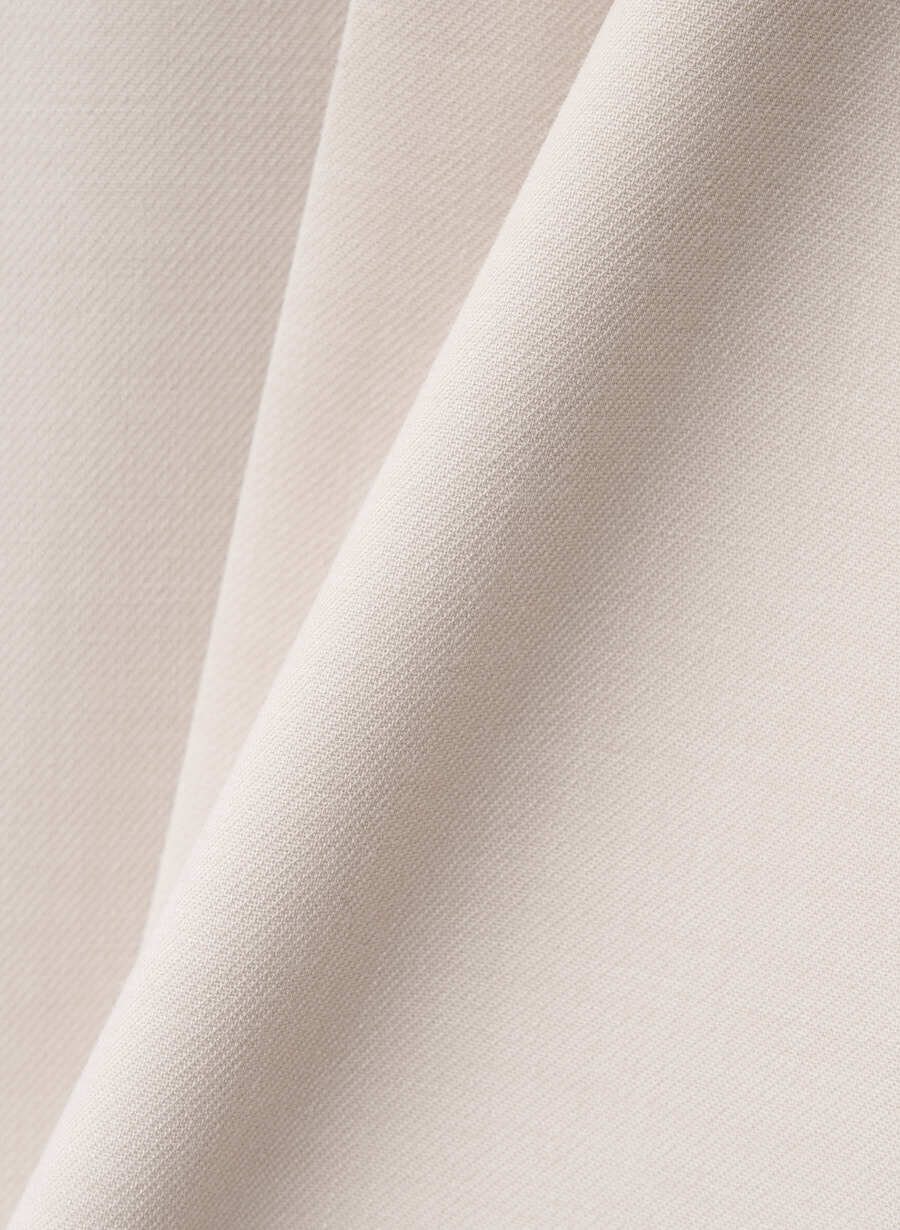 レーヨン・ポリエステルの混紡糸を使用して高密度に織り上げる事による、梳毛調のさらりとしたタッチと仕立て映えのする素材感が特徴。