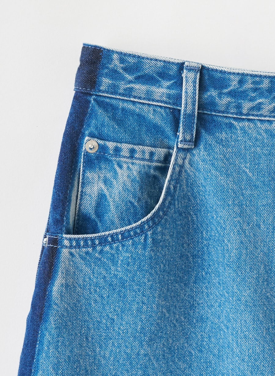 両脇の脇線を仮縫いでつまんだ状態で洗い加工を施した後、仮縫い部分を外してライン状に濃淡差を出すという時間と手間のかかる工程を経て今年らしいデザインに仕上げました。